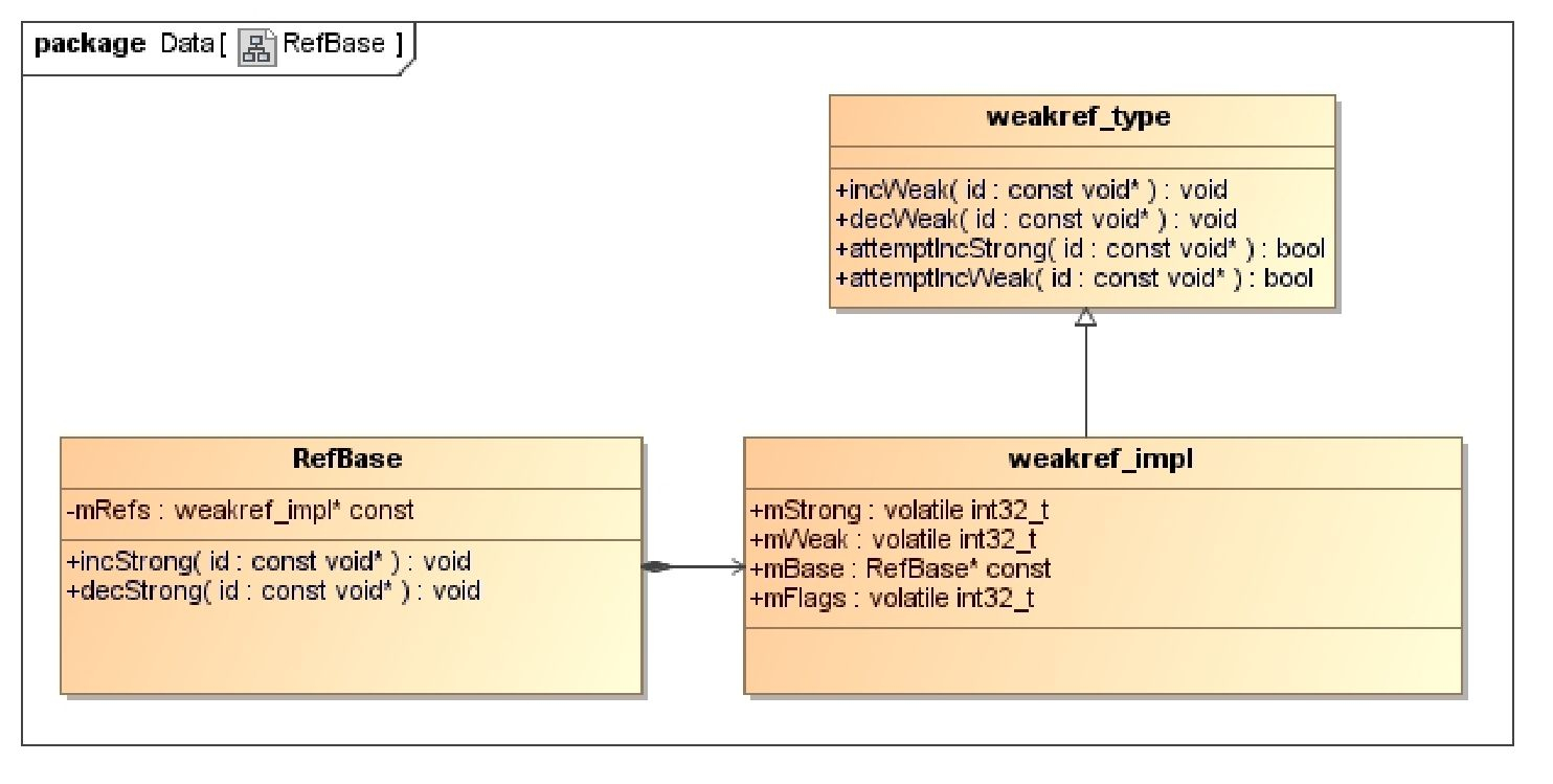 如果一个类的对象要支持使用强指针和弱指针,那么它就必须从RefBase类继承下来,因为RefBase类提供了强引用计数器和弱引用计数器。