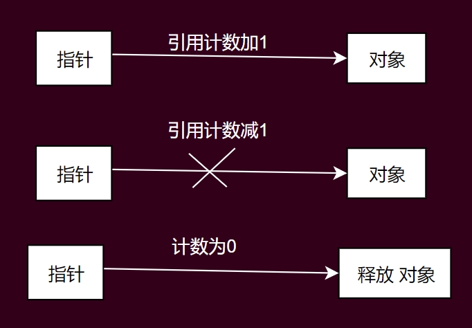 每当有一个新的指针指向了一个对象时, 这个对象的引用计数就增加1 ; 每当有一个指针不再指向一个对象时, 这个对象的引用计数就减少1 ; 当对象的引用计数为0时, 它所占用的内存就可以安全地释放了 .