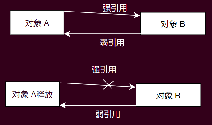 假设对象A为 父 , 对象B为子。 对象A通过强引用计数来引用对象B, 而对象B通过弱智能指针引用计数来引用对象A。 当对象A不再使用时, 对象A的生命周期不受对象B的影响, 此时对象A可以安全地释放。 在释放对象A时, 同时也会释放它对对象B的强引用计数, 因此, 当对象B不再使用时, 对象B也可以安全地释放了。