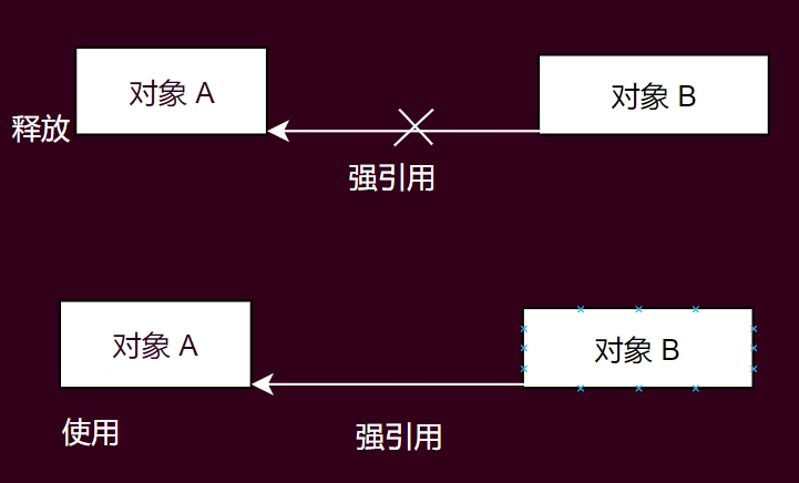 对象的生命周期不受弱引用计数控制, 当对象B想要使用对象A时,先要把对 对象A的弱引用计数升级为强引用计数, 然后才能使用它; 如果对象B不能将对象A的弱引用计数升级为强引用计数, 就说明对象A已经被释放了, 那 对象B就不能再使用它。