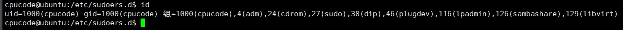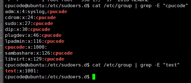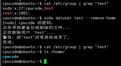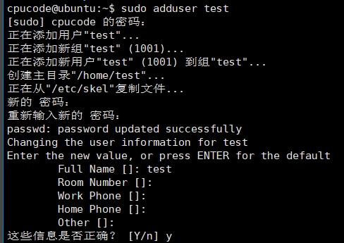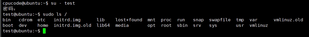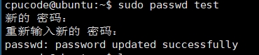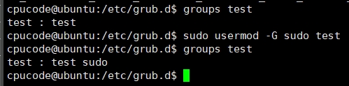 这里我用 cpucode 用户执行 sudo 命令将 test 添加到 sudo 用户组,让它也可以使用 sudo 命令获得 root 权限