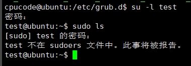 会提示 test 不在 sudoers 文件中,意思就是 test 不在 sudo 用户组中